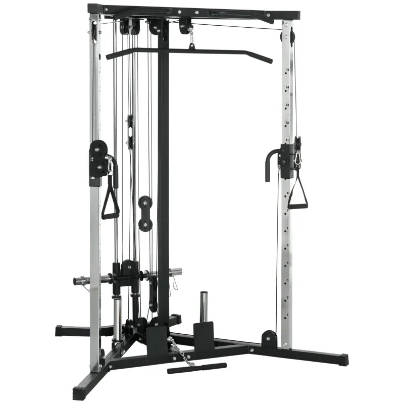 La máquina multifunción SPORTNOW es una excelente opción para quienes desean montar un gimnasio multifuncional en casa. Esta máquina combina varias funciones en un solo chasis, lo que permite realizar una amplia variedad de ejercicios sin necesidad de cambiar de aparato. Incluye una polea alta, una polea baja, un cruce de cables con 15 alturas y una barra de dominadas multiaGarre. Gracias a estas características, es posible trabajar diferentes grupos musculares como el pecho, la espalda, los hombros, los brazos y el core.
